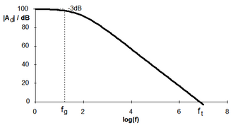 Pojačanje operacijskog pojačala (slika desno) počinje se smanjivati u tom smislu već za ulazni napon frekvencije veće od kojih 50 Hz (fg) i to strminom 6 dB/oktavi, odn. 20 dB/dekadi. Frekvencijskom kompenzacijom pojačanja osigurava se da u području visokih frekvencija signal negativne povratne veze ne može imati dovoljnu veliku amplitudu i dovoljno velik fazni pomak za nastanak samooscilacija.