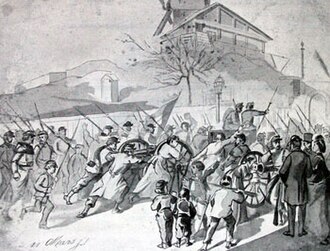Tu su se sad događali razni zbrkani događaji i povijesne knjige o tom kratkom razdoblju do osnivanja Komune nisu baš jasne, ali ono što je jasno je to da je Nacionalna garda, prije nego što su Prusi ušli u Pariz, uz pomoć običnih građana sklonila sve topove (koje su smatrali svojim vlasništvom) daleko od Prusa i čuvala ih je na sigurnom. Jedno od glavnih "topovskih parkirališta" je bilo na vrhu Montmartrea.