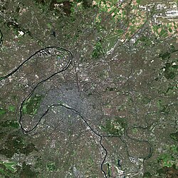 Grad Pariz pokriva područje mnogo manje od cijele urbane zone kojoj je središte. Trenutno, pariška stvarna urbanizacija, koju definira pôle urbain (gradsko područje) statistička zona, pokriva 2723 km2,[43] ili područje oko 26 puta veće od samoga grada. Uprava pariškog urbanog rasta podijeljena je između samoga grada i okolnih departmana: Parizu najbliži prsten tri susjedna departmana, ili petite couronne ("mali prsten") potpuno je zasićen rastom grada, dok je daljni vanjski prsten četiri departmana, grande couronne pokriven urbanizacijom samo u unutarnjim područjima. Tih osam departmana stvaraju veću administrativnu regiju Île-de-France, koja je većinom ispunjena pariškim urbanim područjem.