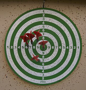 Standardna meta promjera 45,1 cm [2] nalazi se na udaljenosti 2,37 m od natjecatelja i obješena je na zid ili neki drugi oslonac na visini 1,73 m (od poda do centra mete). Dijagonala od linije bacanja do centra mete je dužine 2,934 m.