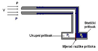 gdje je: v - brzina, pt - ukupni tlak (u ovom slučaju je riječ o stagnacijskom tlaku), ps - je statički tlak i ρ - gustoća sredstva (zraka).