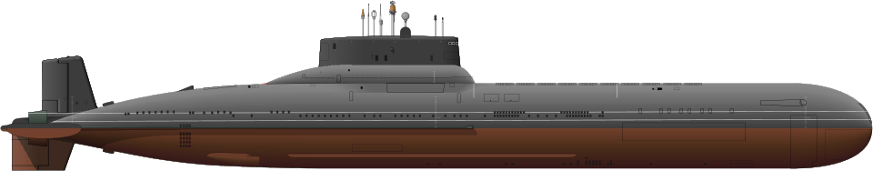 | Naoružanje: | Interkontinentalni balistički projektili RSM-52/3M20 svaki s po 10 bojnih glava snage 200 kT, protuzračne rakete SAM-SA-N-8 Gremlin (na površini), brod-brod rakete A/S Novotar SS-N-15 Starfish (ispaljuju se iz torpednih cijevi), 200 kT torpeda Vodopad ili Veder tip 40, Torpeda tpa 65, 6 torpednih cijevi (533 mm), nosi najviše 20 torpeda, mogućnost nošenja mina |
