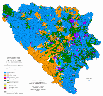 Stanovništvo Bosne i Hercegovine po općinama prema popisu iz 1961. godine; Hrvati - tamno plava, Srbi - crvena, Muslimani - zelena, Jugosloveni - maslinasta [[Slika:|220px|Stanovništvo Bosne i Hercegovine po općinama prema popisu iz 1961. godine; Hrvati - tamno plava, Srbi - crvena, Muslimani - zelena, Jugosloveni - maslinasta]]