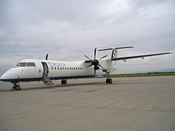 ...istaknute karakteristike Dash-8 dizajna su: veliki T-rep (horizontalni stabilizator na vrhu vertikalnog) s čime je izbjegnuto vrtloženje prilikom uzlijetanja oko horizontalnog stabilizatora uzrokovano radom elisa; uvlačeći stajni trap ulazi prema nazad u produženu oplatu motora; visoka vitkost krila (eng. aspect ratio). Prvi let Dash-8 imao je 20. lipnja 1983. a u upotrebu je ušao 1984. godine. Osnovne prednosti prema Dash-7 su bolje karakteristike leta i niži troškovi korištenja i održavanja.