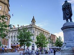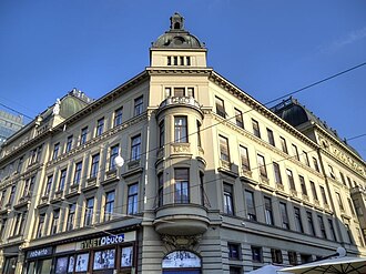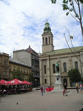 Trg Petra Preradovića sa spomenikom Petru Preradoviću u prvome planu, s lijeve strane Palača Prve hrvatske štedionice, ravno palača Farkaš (Atelijer Hönigsberg & Deutsch.