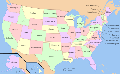 4. Aljaska and Havaji su prikazani u drukčijim omjerima; Aleutski otoci i nenaseljeni sjeverozapadni Havajski otoci su izostavljeni s ove karte
