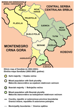 U općinama Novi Pazar, Tutin, Sjenica, Plav i Rožaje većinu stanovništva čine Bošnjaci. U općinama Priboj, Prijepolje, Nova Varoš i Pljevlja (i Mojkovac) većinsko stanovništvo su Srbi. Crnogorske općine Bijelo Polje i Berane su etnički mješovite sa relativnom srpskom većinom.