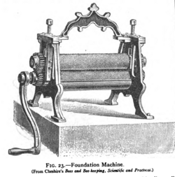 Kotačić za utapanje žice služi za utiskivanje kanala za žicu u satnoj osnovi. Razlikujemo dva modela kotačića: njemački (sitnih zubi razrezanih po sredini) i američki (krupnijih nerazrezanih zubi). Bez obzira na model, pčelar prvo ugrije kotačić u toploj vodi (žica je već na svom mjestu na satnoj osnovi) i onda polako prelazi njime po žici, topeći pčelinji vosak i utiskuje žicu tvoreći preko nje mostiće od otopljenog voska. U istu svrhu služi i električni transformator (ispravljač, trafo, žvrk) uređaj čiji se rad zasniva na osnovu elektromagnetske indukcije, a pretvara električni napon jedne vrijednosti (u našem slučaju 220 V) u napon druge vrijednosti (12 V). Transformatorom se žica utapa u satnu osnovu putem zatvorenog kruga oslabljene električne struje. U istu svrhu može poslužiti i punjač za akumulator automobila, no valja pripaziti, jer radi puno brže.