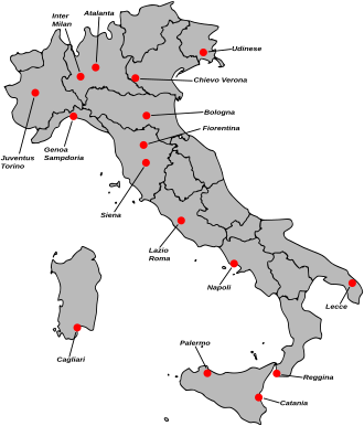 | ATA | BOL | CAG | CTN | CHV | FIO | GEN | INT | JUV | LAZ | LEC | MIL | NAP | PAL | REG | ROM | SAM | SIE | TOR | UDI | |