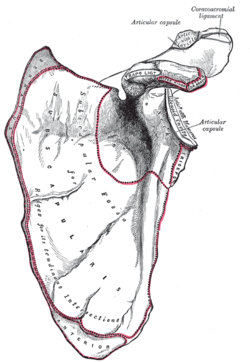 Lateralnu površinu lopatice obilježava konkavno zglobno tijelo zgloba ramena, cavitas glenoidalis.Neposredno iznad udubine nalazi se tuberculum supraglenoidale (polazište caput longum m. bicipitis brachii).Nešto dalje,ispod glenoidalne udubine nalazi se tuberculum infraglenoidale (polazište caput longum m. tricipitis brachii).