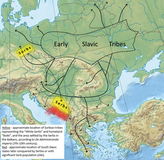 Prema DAI, živjeli su „od početka” u regiji koju su zvali Boiki (Bohemija; pogreška Konstantina VII. koju treba shvatiti kao "blizu" umjesto "u"[31]). Također dalje izvještava da je, kada su dva brata naslijedila oca, jedan od njih migrirao je s polovicom ljudi iz Bijele Srbije na Balkan za vrijeme vladavine cara Heraklija (610. – 641.), nakon što Hrvati već došli i stupili u kontakst s istim carom.[131][132] Prema tradicionalnoj historiografiji, u skladu s općenitom identifikacijom Bijele Srbije sa zemljom Sorba, povjesničari koji slijede ovu perspektivu obično smatraju neimenovanog arhonta koji je predvodio Srbe na Balkan srodnikom Dervana.[133][134][135]