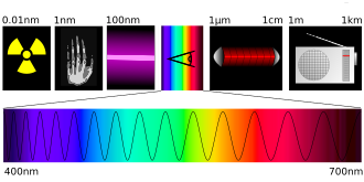 Vidljivi spektar (koji zamjećuje ljudsko oko) odgovara nizu boja što nastaje rasapom bijele Sunčeve svjetlosti (disperzija; duga), od ljubičaste (valne duljine 380 nm), preko plave, zelene, žute i narančaste do crvene (780 nm).