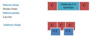 Dok se obavlja sinkrona U/I operacija SUBP nije u mogućnosti nastaviti dalje te je prisiljen pričekati dok se U/I operacija završi. U sinkronome čitanju, moramo identificirati red (prikazan kao C za predstavljanje dijela procesorskog vremena na slici 1.1), pristupiti stranici i obraditi redak prikazan kao drugi dio procesorskog vremena), a svaka razina zahtjeva da se prijašnja razina završi. Svaka grupa blokova se dobavlja i obrađuje na način prikazan na slici 1.1 gdje se može vidjeti da sinkrono čitanje započinje dobavljanje čitave aktivnosti prije nego se prva stranica krene obrađivati da smanji prvotno čekanje Asinkrono čitanje se odvija unaprijed, tijekom obrade ranije pročitanih blokova. Asinkrono čitanje omogućuje značajno preklapanje čitanja i obrade blokova. Idealno, asinkrono čitanje može završiti i prije nego što je prethodno pročitani blok obrađen.