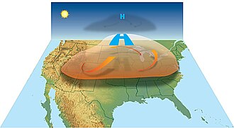 Ljetni vremenski obrasci uglavnom se sporije mijenjaju nego zimi. Kao rezultat, ovaj visoki tlak gornje razine također se polako kreće. Pod visokim pritiskom zrak se spušta (tone) prema površini, zagrijavajući se i sušeći se adijabatski, kočeći konvekciju i sprečavajući stvaranje oblaka. Smanjenje oblaka povećava zračenje kratkog vala koje dopire do površine. Niski tlak na površini dovodi do površinskog vjetra s nižih geografskih širina koji donosi topli zrak, pojačavajući zagrijavanje. Alternativno, površinski vjetrovi mogli bi puhati iz vruće kontinentalne unutrašnjosti prema obalnom pojasu, što bi tamo dovodilo do toplinskih valova, ili od visokog uzvišenja prema niskom uzvišenju, povećavajući slijeganje, a time i adijabatsko zagrijavanje.[9] [10]