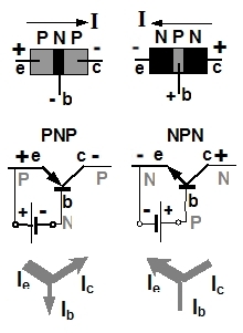 Takav tranzistor sastoji se od dviju kristalnih dioda. Baza i kolektor čine takozvanu kolektorsku diodu, a baza i emiter emitersku diodu. Te dvije diode u stvari su srasle jedna u drugu. Stavimo između emitera E i kolektora C jednog PNP tranzistora određeni električni napon UC. Emiter je spojen s pozitivnim, a kolektor s negativnim polom izvora struje. Stoga struja u kolektorskom krugu neće teći jer je smjer propusta struje kolektorske diode suprotan smjeru propusta struje emiterske diode. No pustimo li preko baze (B) struju Ib, teći će struja i preko kolektora. Kolektorska struja IC može biti i 100 puta jača od struje koja prelazi preko baze. Na taj način možemo mijenjanjem slabe pomoćne struje IB regulirati vrlo jake struje IC, koje teku kroz tranzistor preko kolektora. Pomoćnu struju IB možemo mijenjati uzimanjem većeg ili manjeg broja galvanskih članaka ili mijenjanjem električnog otpora R. Svakoj promjeni struje IB odgovara promjena struje IC. Omjer jakosti kolektorske struje IC i struje IB koja teče preko baze zove se faktor strujnog pojačanja tranzistora β: