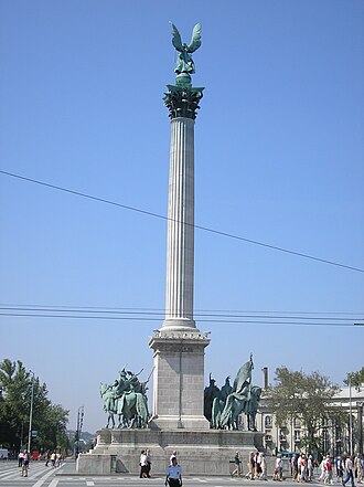 Izgradnja Milenijskog spomenika je počela 1896. godine povodom obljetnice 1000 godina dolaska mađarskih osvajačkih plemena u područje karpatskog bazena i panonske nizine, a pod vodstvom Arpada, prvog velikoga kneza, čiji kip se nalazi na podignutoj bazi u podnožju stupa, koji je okružen sa šest kipova konjanika koji zajedno s Arpadom predstvljaju vođe mađarskih osvajačkih plemena. Iako su bili malobrojni, bilo im je lakoizvedivo pokoriti raštrkano stanovništvo. Njihov dolazak s jedne strane spriječio je širenje njemačke države na istok, a s druge je strane razdvojio sjeverozapadne slavene od južnih. U doba doseljenja mađarskih nomadsko-stočarskih plemena, neki od mađarskih glavara već su primili kršćasnku vjeru posredovanjem Bizanta. Arpadov praunuk Geza priklonio se zapadu i primio kršćanstvo zapadne crkve. Unutarnji otpor zemlje kristianizaciji ugušio je pomoću svećenika i njemačkih vitezova koje je nagrađivao s darivanjem zemlje. Njegov rad nastavlja njegov sin Vajk.