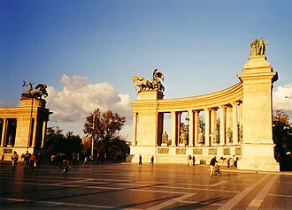Na centralnom dijelu trga nalazi se Milenijski spomenik, najznačajniji nacionalni spomenik čiji centralni dio zauzima graciozan, žljebasti, 36-metarski, korintski stup, na čijem se vrhu, tj. kapitelu, nalazi krilati kip arkanđela Gabrijela, dok u pozadini stupa možemo vidjeti 85-metarske kolonade, koje osim strukturalne, u ovom slučaju imaju i dekorativnu vrijednost. Koncept Milenijskog spomenika bazira se na ranijima Shickendanzovim djelima, a stilski se oslanja na tradicionalan stil gradnje s dijelovima koji podsjećaju na povijesne stilske forme, u ovom slučaju antičke, što je bila oznaka kiparstva na prijelazu iz 19. u 20. stoljeće.