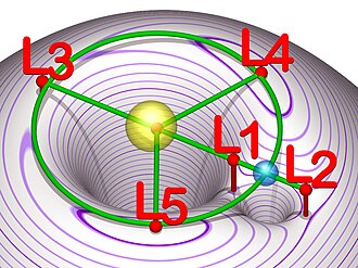 Na slici je prikazano gravitacijsko polje u okolini jednog vezanog sustava s masama M1 i M2; u tom polju giba se treće tijelo s masom mnogo manjom od mase prvih dvaju tijela. Sva se tri tijela gibaju u istoj ravnini i zadržavaju jednak razmještaj samo onda ako se treće tijelo nalazi u području jedne od točaka L1, L2, L3, L4 i L5 (točke libracije ili Lagrangeove točke), uz uvjet da su i početne brzine strogo određene. Prve tri točke smještene su na pravcu koji povezuje mase M1 i M2, a točke L4 i L5 smještene su na vrhovima dvaju jednakostraničnih trokuta, kojima se zajednička baza pruža od M1 i M2. Taj se razmještaj javlja u nekih nebeskih objekata! Na primjer u Lagrangeovim točkama L4 i L5 smještena je grupa planetoida, Trojanaca, koji stazom Jupitera (M2) putuju istim prosječnim periodom koji ima i Jupiter, oko Sunca (M1). Točke L1, L2 i L3 imaju važnu ulogu u prenošenju bliskih dvojnih zvijezda. Tamo plinovi struje s jedne zvijezde na drugu, obmataju ih ili zauvijek odlaze s dvojne zvijezde. Krivulje na slici mjesta su stalnog zbroja gravitacijskog i centrifugalnog potencijala masa M1 i M2. Najmanja zajednička ploha koja obmata obje mase, a u presjeku s ravninom crtnje ima oblik osmice, zove se ploha Rochea. [4]