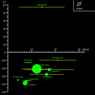 Svi uranovi vanjski sateliti, osim Margaret, kreću se u retrogradnim putanjama sa inklinacijama između 140° i 170°.