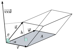 Iznos vektorskog produkta je, po definiciji, jednak površini paralelograma kojega određuju vektori i Obrada nije uspjela. (Conversion error. Server ("https://wikimedia.org/api/rest_") reported: "Cannot get mml. Server problem."): {\displaystyle \scriptstyle {\vec {w}}} (obojan sivo, površina označena slovom A). Iznos skalarnog produkta vektora i jednak je umnošku te površine i projekcije vektora na vektor , koja je označena slovom h. Dakle, rezultat mješovitog produkta je volumen prikazane kose prizme, V=Ah.