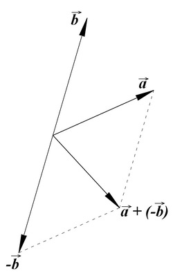 Oduzimanje vektora Obrada nije uspjela. (MathML sa SVG ili PNG za rezervu (preporučljivo za moderne preglednike i alate za pristupačnost): Invalid response ("Math extension cannot connect to Restbase.") from server "https://wikimedia.org/api/rest_v1/":): {\displaystyle \scriptstyle \vec b } od vektora Obrada nije uspjela. (Conversion error. Server ("https://wikimedia.org/api/rest_") reported: "Cannot get mml. Server problem."): {\displaystyle \scriptstyle {\vec {a}}} isto je što i dodavanje suprotnog vektora, tj. Obrada nije uspjela. (MathML sa SVG ili PNG za rezervu (preporučljivo za moderne preglednike i alate za pristupačnost): Invalid response ("Math extension cannot connect to Restbase.") from server "https://wikimedia.org/api/rest_v1/":): {\displaystyle \scriptstyle \vec a - \vec b = \vec a +(- \vec b)} . Takav postupak grafički je prikazan niže u "matematičkom" dijelu teksta.