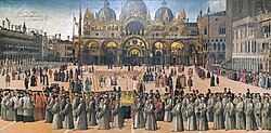 Počeci grada koji se rasprostire na 117 otoka i otočića koje pješčani sprud, Lido, štiti u laguni počinju u 5. stoljeću. Tada su od Huna progonjeni stanovnici Akvileje pobjegli na neke od tih močvarnih otoka. U tom skloništu začelo se vojvodstvo sa duždem na čelu (697.) i napokon se tu rodila trgovačka metropola, svetome Marku jer su kosti apostola donijeli iz Aleksandrije, koja je zavladala Jadranskim, a kasnije i Sredozemnim morem. Carigrad je osvojio i opljačkao 1204. god. dužd Enrico Dandolo uz veliku pomoć križarskih postrojbi.