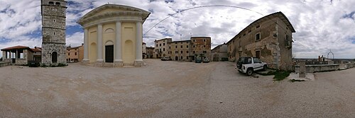 Novi i stari dio naselja povezuje kamenom popločana ulica koja završava gradskim vratima. Ona su ulaz na gradski trg na kojem se nalaze barokna loža, cisterna, zvonik i župna crkva sv. Kvirika i Julite građena u neoklasicističkom stilu. Župna crkva se spominje još 1203. g., ali sadašnji oblik poprima tek 1833.g. Od ostalih sakralnih spomenika treba spomenuti ranogotičku crkvu sv. Antuna opata iz 15. st. i Sv. Matija (Cerion) sa glagoljskim grafitima i natpisima i crkvu sv. Roka iz 1929. g.