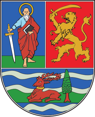 - Bačka – Na plavom polju sa zelenom travom stoji Sveti Pavao u plavoj košulji i crvenoj togi i sa zlatnom oreolom. U desnoj ruci drži srebrni mač sa zlatnom drškom uperen naniže, a u lijevoj Bibliju. Ovaj grb je Bačkoj (na mađarskom Bács) dodijelio kralj Leopold I. (1657. – 1705.) godine 1699. Bačka je podijeljena između Mađarske i Kraljevine SHS, s čim je mađarski dio utopljen u veću Bač-Kiškun (Bács-Kiskun) županiju, ali je ovaj grb ostao dijelom grba te županije.