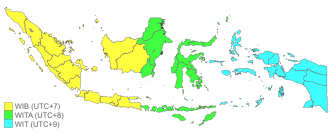 Vremenske zone u Indoneziji. Indonezijsko se otočje zemljopisno prostire kroz četiri vremenske zone, od UTC+6 u Acehu do UTC+9 u Zapadnoj Papui. Indonezijska vlada priznaje tri zone: zapadnoindonezijsko vrijeme—koje je sedam sati ispred (UTC+7) greenwichog vremena, GMT), srednjoindonezijsko vrijeme— koje je osam sati ispred (UTC+8) greenwichkog i istočnoindonezijsko vrijeme—koje je devet sati ispred (UTC+9) greenwichkog. Granica između zapadne i središnje vremenske zone je crta koja prolazi između otoka Jave i Balija kroz središnji dio Bornea. Granica između središnje i istočne vremenske zone prolazi sjeverno od istočnog kraja Timora prema istočnom kraju Sulawesija.