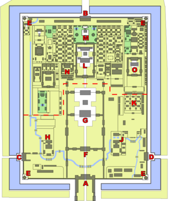 | A. Meridijanska vrata B. Vrata velikog mira C. Zapadna vrata slave D. Istočna vrata slave E. Kutni tornjevi F. Vrata vrhunskog sklada G. Palača velikog mira | H. Dvorana za vojne prijeme J. Dvorana književne slave K. Tri južne palače L. Palača božanske čistoće M. Carski vrt N. Dvorana misaonog rasta O. Palača mirne dugovječnosti |