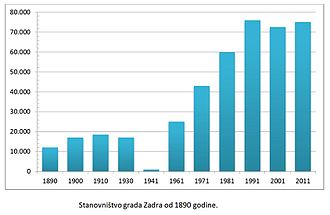 Prije Prvog svj. rata, prema popisu iz 1910. Zadar je imao 19 500 stanovnika. Nakon prepuštanja Kraljevini Italiji grad je napustilo oko 9000 Hrvata, započela je stagnacija i relativno nazadovanje u odnosu na druge hrvatske priobalne gradove, a kasnija je obnova tekla vrlo usporeno. Prije Drugog svjetskog rata, grad Zadar je imao oko 17 000 stanovnika. Nakon teških bombardiranja i iseljavanja Talijana neko je vrijeme stagnirao, a prema svjedočanstvima, navodno neko vrijeme u staroj gradskoj jezgri nije bilo niti jednog stanovnika, a 1948. popisano je nešto preko 13 000 stanovnika. Ubrzaniji gospodarski razvoj započeo je tek sredinom 50-tih, i populacijski i teritorijalno. Tako je 1961. imao 25 000 stanovnika, 1971. – 43 000, 1981. – 60 000, a 1991. čak 76 000. Ubrzanom izgradnjom su u njegov sastav 80-tih godina uključena dotad zasebna prigradska naselja Bokanjac, Diklo, Ploče i Dračevac.