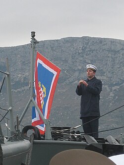 - ↑ Pravilnik o tehničkim uvjetima izrade, postupku i načinu isticanja te vijanju zastava i plamenaca na ratnim brodovima Republike Hrvatske