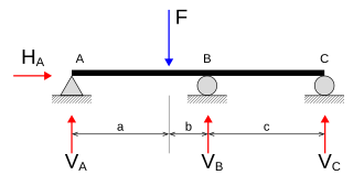 Za gredu na slici desno su četiri nepoznate reakcije oslonaca (veza) A, B, C) i A. Jednadžbe ravnoteže su: