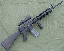 | [[M4 (karabin) |M4A1]]<ref name="jihadology.net">{{ | | [[M4 (karabin) |M4A1]]<ref name="jihadology.net">{{citiranje weba|url=http://jihadology.net/2015/04/17/new-video-message-from-the-islamic-state-messages-from-the-fortified-strongholds-4-wilayat-kirkuk/|title=New video message from The Islamic State: "Messages from the Fortified Strongholds #4 – Wilāyat Kirkūk"|work=JIHADOLOGY|accessdate=30. lipnja 2016.}}</ref>|| [[Jurišna puška]] || Nepoznata količina || [[Sjedinjene Američke Države|SAD]] || [[File:M4A1 ACOG.jpg|230px]] || Zapljenjene iračkoj vojsci i policiji. | ||