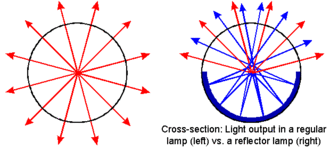 [[ | [[Datoteka:Reflectorlamp.gif|thumb|Presjek kroz fluorescentnu svjetiljku sa i bez reflektora]] | ||