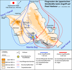 | Datoteka:Pearl Harbor 1941 de.svg Karta otoka Oahu s pravcima naleta japanskih aviona | |||||||