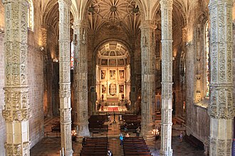Unutrašnjost crkve ima izvanredno bogat i raskošan glavni brod (arhitektura) s dekoriranim manuelinskim stupovima i lukovima. Na samom ulazu u crkvu su grobovi moreplovaca Vasca da Game i Luísa de Camõesa. Barokni transepti su mjesto kraljevskih grobnica, kao i kapela u kojoj je srebrni ciborija iz 17. stoljeća koji je Alfons VI. Portugalski podigao u spomen na pobjedu u bitci za Montes Claros (1665.) protiv španjolskog kraljevstva.
