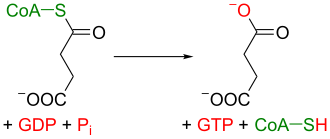 Jednadžba reakcije: sukcinat-CоА + Pi + GDP → sukcinat + GTP + CоА-SH Organizam ne koristi direktno GTP kao molekulu visoke energije (GTP ima ulogu signalne molekule). Njegova je uloga u Krebsovom ciklusu da posluži kao međuspoj koji prebacuje fosfatnu grupu na ADP kako bi se stvorio ATP. Tu reakciju katalizira enzim nukleozid difosfokinaza.