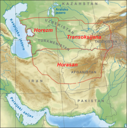 - ↑ 1,0 1,1 Britannica (2011.): Khorasan „Khorāsān, also spelled Khurasan, historical region and realm comprising a vast territory now lying in northeastern Iran, southern Turkmenistan, and northern Afghanistan. The historical region extended, along the north, from the Amu Darya (Oxus River) westward to the Caspian Sea and, along the south, from the fringes of the central Iranian deserts eastward to the mountains of central Afghanistan. Arab geographers even spoke of its extending to the boundaries of India.”