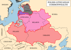 Obrisi Poljsko-litvanskog saveza s glavnim pokrajinama oko 1619. god. i današnje granice država