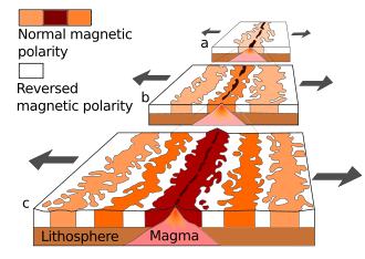 Početkom 1950-ih, znanstvenici, uključujući Harrya Hessa, koristeći magnetometar prilagođen za zračne uređaje, razvijen tijekom Drugog svjetskog rata za detektiranje podmornica, počeli su prepoznavati čudne magnetske promjene duž oceanskog dna. Ovaj neočekivani pronalazak nije u potpunosti bio iznenađujući jer je bilo poznato da bazalt, efuzivna stijena bogata željezom koja izgrađuje oceansko dno, sadrži visoko magnetičan mineral magnetit koji može lokalno poremetiti očitanja kompasa. Ovaj poremećaj prepoznali su Islandski mornari u osamnaestom stoljeću. Što je važnije, ove svježe otkrivene magnetske promjene osigurale su nova sredstva za proučavanje oceanskog dna, jer prisutnost magnetita daje bazaltu magnetska svojstva koja se mogu mjeriti. Kada se novoformirana stijena skrutne, magnetski materijal u sebi sačuva tadašnji magnetski polaritet.