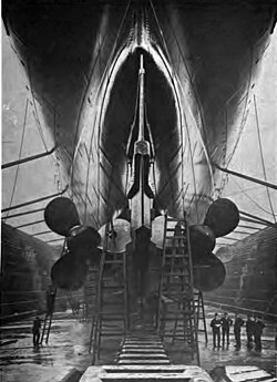 | Pogon | 4 parne turbine Parsons bez reduktora, dvije visokotlačne, dvije niskotlačne. 68 000 ks nominalnih pri porinuću, 76 000 ks pri obaranju rekorda, kasnije povećano na 90 000 ks nakon konverzije na naftu. 4 propelera, trokraki, 1908. zamijenjeni za četverokrake. Krmene turbine samo za unutarnje osovine. |