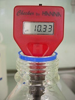 pH se obično mjeri pH-metrom, a pH vrijednost je razlika elektromotorne sile (električni potencijal i napon) između odgovarajućih elektroda smještenih u otopini koja se ispituje. U osnovi pH metar je voltmetar spojen na elektrodu, koja reagira na promjene pH, i referentnu (nepromjenljivu) elektrodu. Na pH osjetljiva elektroda je obično staklo a referenca je obično živa-živin klorid (kalomel) elektroda. Također se koriste srebro-srebrov klorid elektrode. Kada su dvije elektrode uronjene u otopinu one djeluju kao baterija. Staklena elektroda razvija električni potencijal koji je izravno povezan s aktivnošću vodikovih iona u otopini, a voltmetar mjeri razliku potencijala između stakla i referentne elektrode. Instrument može imati ili digitalni ili analogni prikaz rezultata. Digitalni prikaz ima prednost točnosti očitavanja dok analogna očitavanja daju bolje pokazatelje stope promjena. Baterijom napajani prijenosni pH-metari se široko koriste za terenska ispitivanja pH tla. Testovi pH mogu se provesti i manje precizno lakmus papirom ili miješanjem indikatorskih boja u tekuće suspenzije i njihovim nanošenjem na papir. Dobivene boje se uspoređuju s kalibriranim grafom boja koje odgovaraju određenom pH.[3]