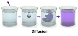 Bitno je napomenuti da je difuzija miješanje kemijskih tvari bez ikakvog vanjskog utjecaja. Ta se pojava zbiva uslijed gibanja molekula, koje zbog svoje brzine prodiru u susjedne tvari. Na primjer ako u epruvetu ulijemo otopinu modre galice CuSO4, a iznad nje nalijemo vodu, te epruvetu pustimo neko vrijeme na miru, vidjet ćemo da će otopina modre galice, i ako je teža od vode, prodirati u vodu. U tehnici se difuzija iskorišćuje za odjeljivanje plinova različitih molekularnih masa, a isto tako i za dobivanje izotopa. Plinovi vrše difuziju, to jest difundiraju u krute tvari, pa se ta difuzija naziva adsorpcija. Difuzija plinova u tekućine naziva se apsorpcija. Apsorpcija se primjenjuje za postizavanje vakuuma u elektronskim cijevima. Pokusi su pokazali da je količina apsorbiranog plina u tekućini to veća što je veći tlak iznad tekućine i što je niža temperatura tekućine.[2]