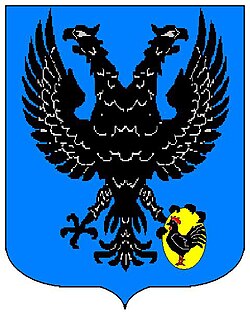 (HR) Podjela na četvrtine sa središnjim grbom: 1 četvrtina: na plavom polju srebreni labud, 2 i 3 četvrtina: na crvenom polju srebrene rešetke (tri okomite i tri vodoravne grede), 4 četvrtina polovina crnog pijetla okrunjenog zlatnom krunom, koji izlazi s desna, središnji grb: na srebrenom polju srebreni jelen u hodu na desno glavom okrenut na lijevi, iznad jelena tri šastokrake srebrene zvijezde. [6/17] | |