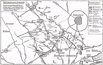Poslije forsiranja Dunava 23. studenog 1916. kod Svištova, njemačka Dunavska armija generala Robert Koscha krenula je prema Bukureštu i 30. studenog naišla na jači rumunjski otpor pred rijekom Argeş. Istovremeno, njemačka 9. armija generala Ericha von Falkenhayna potiskivala je rumunjsku 1. armiju, prešla rijeku Teleorman kod Unghenija i Piteştija te 30. studenog zauzela grad. Istog dana, 9. armija stavljena je pod zapovjedništvo feldmaršala Augusta von Mackensena, zapovjednika njemačkih snaga u Bugarskoj i Dobrudži. On je donio odluku da se koncentričnim napredovanjem prema Bukureštu obuhvate i unište rumunjske snage koje bi se našle zapadno od grada.