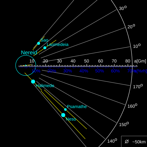 No, dok je prosječna udaljenost Tritona od Neptuna oko 355 000 km, Nereida, najbliži od preostalih 6 nepravilnih satelita čak je 15 puta dalji (5.5 milijuna km) od Neptuna!