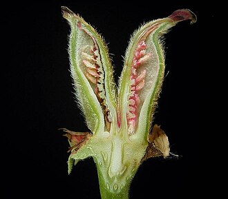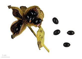Biljka ima okrugle stabljike s prstasto razdijeljenim listovima. Korijen je trajan s nekoliko gomolja. Dva do tri priljubljena tobolca s dlakavom prevlakom sačinjavaju plod, sa sjemenom crvene boje koje zrenjem mijenja boju u crno.