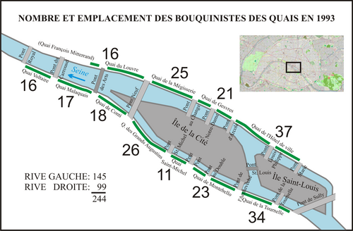 Prema podatcima iz 1993. godine, ukupno 244 štanda bukinista u Parizu raspoređeni su na naspramnim obalama rijeke Seine (slika desno), od mosta Pont de Sully do mosta Pont Royal, u dužini 2 km na lijevoj i 1,5 km na desnoj obali. Štandovi su u stvari "zelene kutije" postavljene na parapetima duž kejeva.