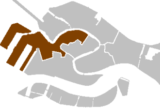Santa Croce može se podijeliti na dva dijela, stariji srednjovjekovni na istoku, i noviji na zapadu koji je nastao nasipanjem zemlje u 19. i 20. stoljeću. Na novom dijelu Santa Crocea nalazi se venecijanska putnička i trajektna luka. Nova luka za prihvat velikih cruisera, izgrađena je 2009. u Tronchettu. Ona omogućuje da se putnici sa tih velikih brodova prebace iz luke do Piazzale Roma za tri minute, pomoću žičare - People Mover duge 822 km. [1] [2]